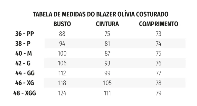 Esta é a tabela base de medidas do molde, medidas do corpo sem folga – utilize para comparar com as medidas do seu corpo.