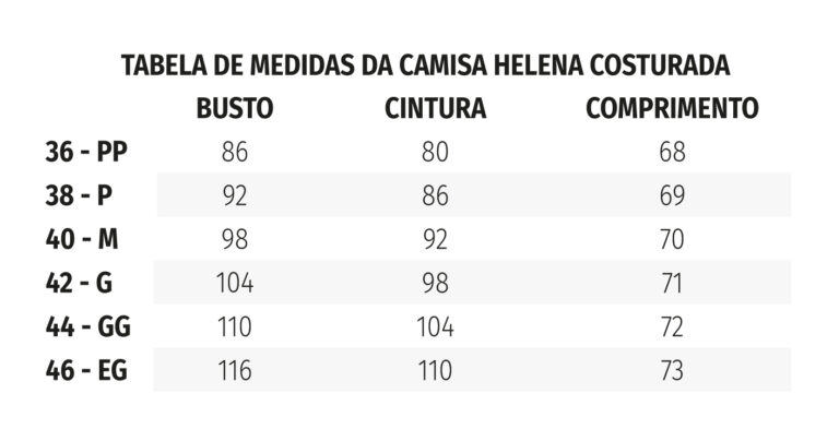 Esta é a tabela base de medidas do molde, medidas do corpo sem folga – utilize para comparar com as medidas do seu corpo.