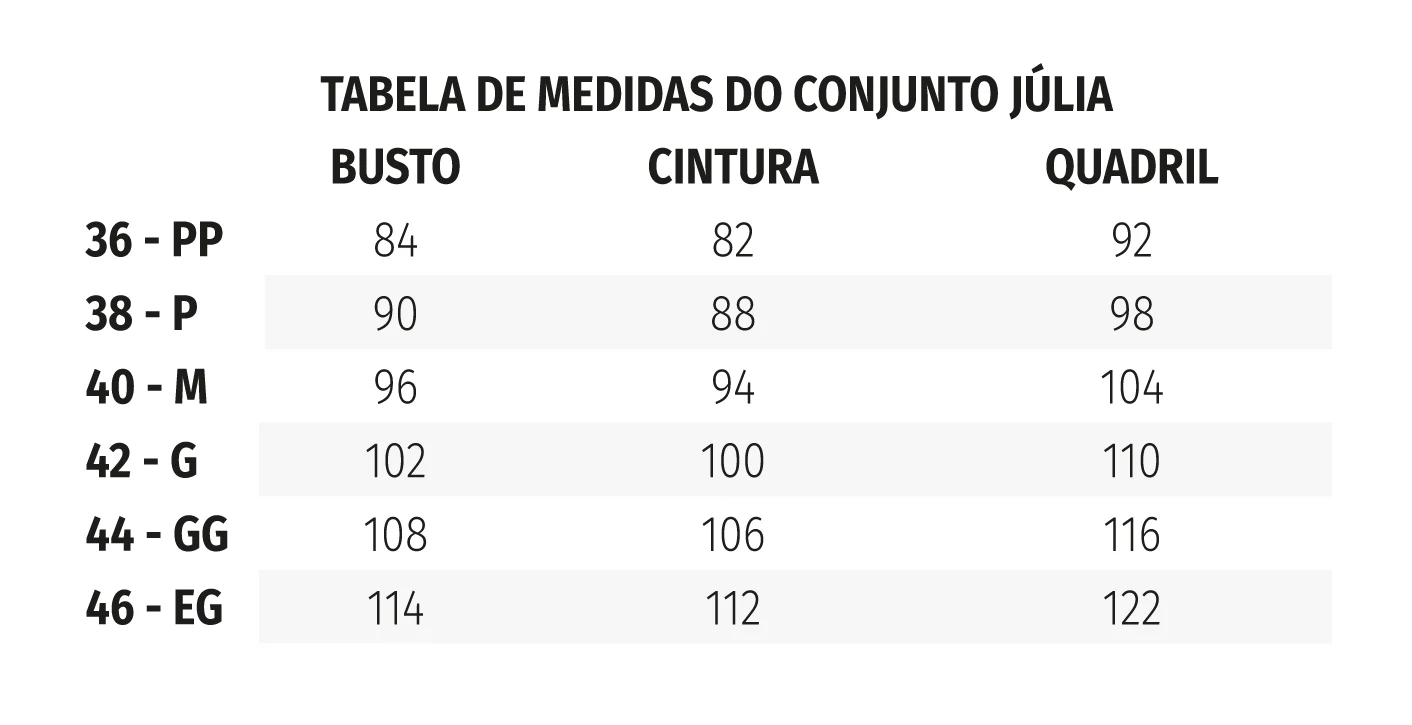 Esta é a tabela de medidas da peça pronta, tire as medidas do seu corpo e compare com a tabela para escolher o melhor tamanho pra você.