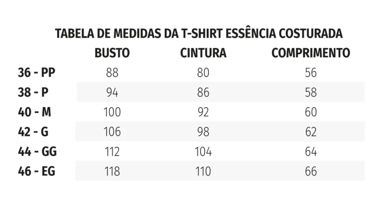 Esta é a tabela de medidas da peça pronta, tire as medidas do seu corpo e compare com a tabela para escolher o melhor tamanho pra você.