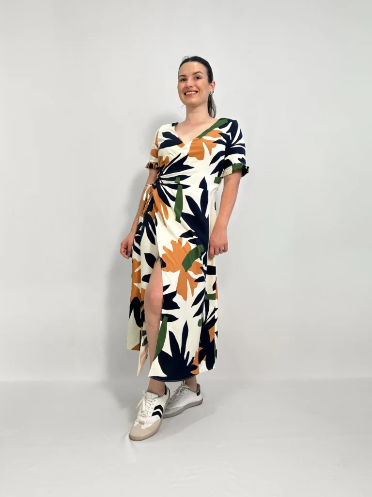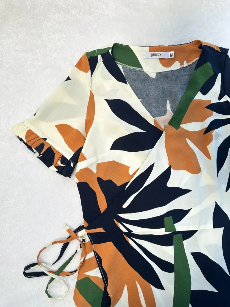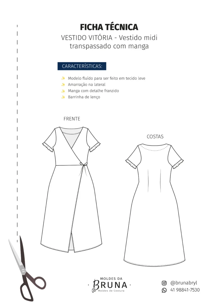 Costure um Vestido belíssimo transpassado com mangas, comprimento midi e detalhes delicados.