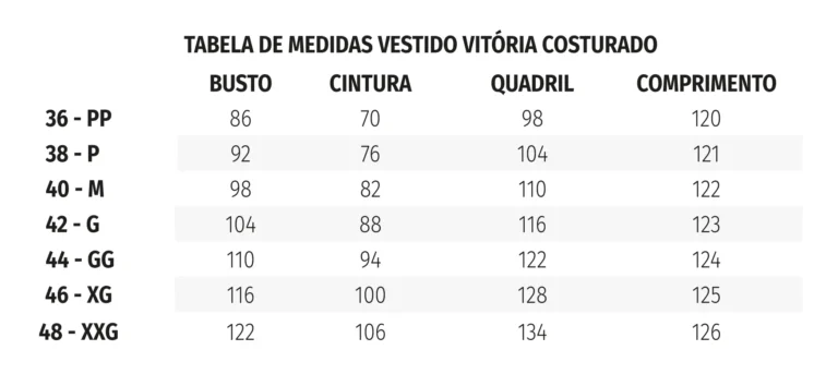 Esta é a tabela base de medidas do molde, medidas do corpo sem folga – utilize para comparar com as medidas do seu corpo.